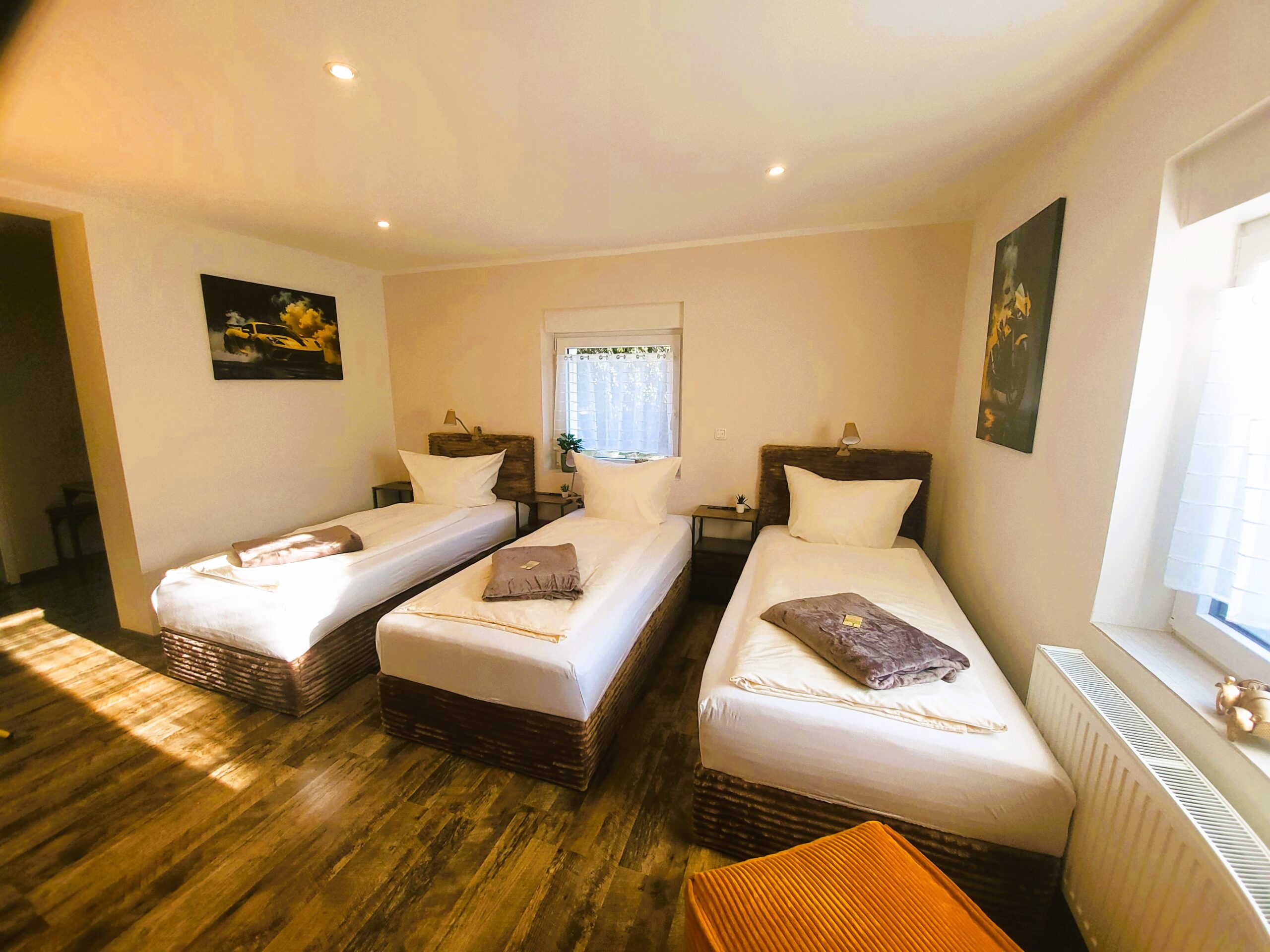 - 3 x Einzelbetten (90×200 Boxspring Bett), 2 x Einzelbett (90×200 Futonbett)in der Dachschräge (für Kleinkinder nicht geeignet)